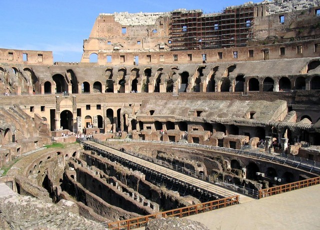 Арена римского Колизея в плохие дни (жара или дождь) могла закрываться натянутым на мачтах тентом. Стоит отметить и пол самой арены. Он был выполнен из дерева, обычно засыпался слоем песка, и был… подвижным. Для проведения морских баталий арена могла заполняться водой из подходящего акведука.
